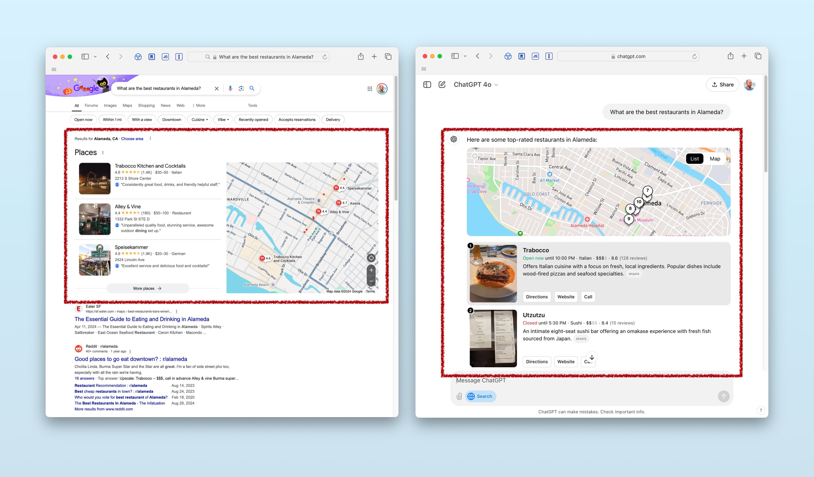 Here are the results on Google on ChatGPT Search for the query, “What are the best restaurants in Alameda?”