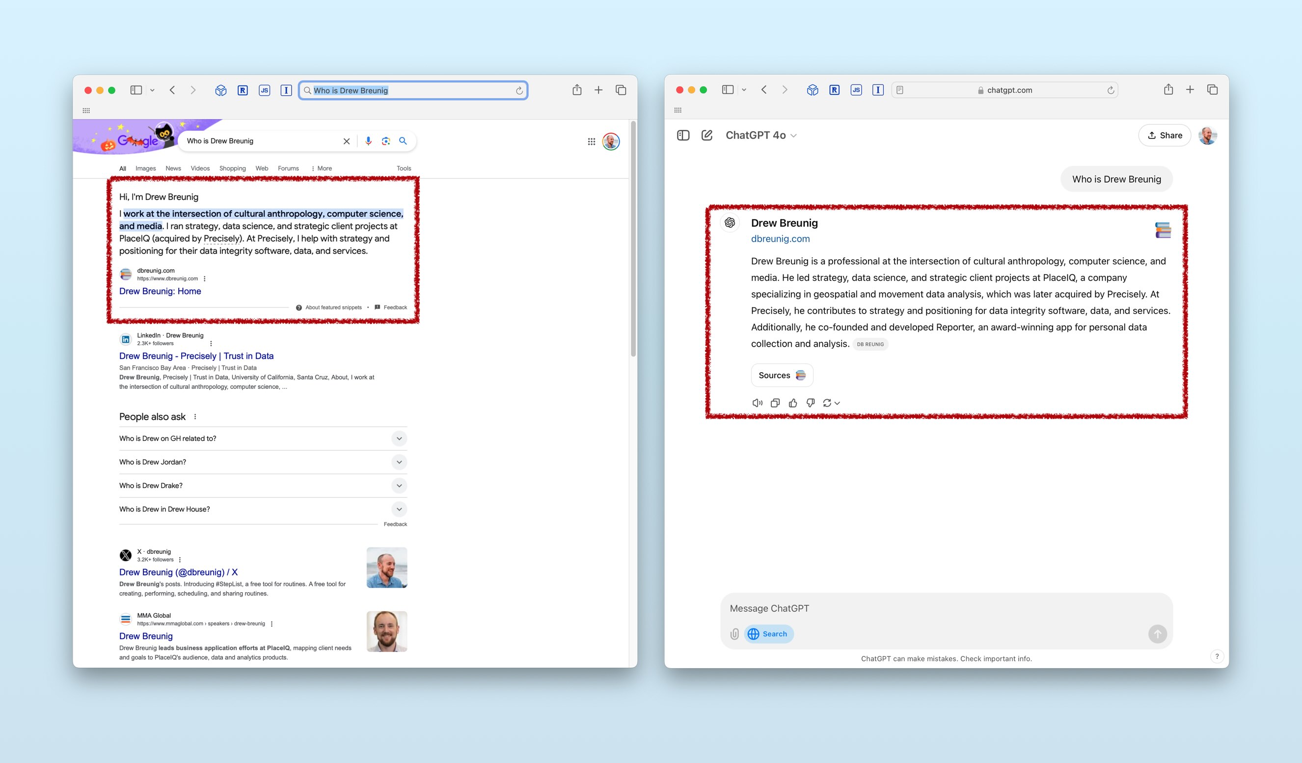 Both Google and ChatGPT grab the bio from the front page of this site and present it at the top, though ChatGPT changes the voice and slightly tweaks the wording.